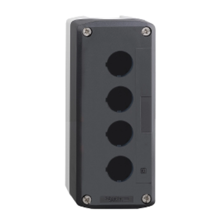 Prazna kutija sa tamnosivim poklopcem sa svetlosivom osnovom, 4 otvora. tip proizvoda ili komponente: prazna upravljačka stanica - namena proizvoda: za XB5 Φ 22 mm upravljačko signalne elemente - IP stepen zaštite: IP69, IP69K, IP66 u skladu sa IEC 60529, IP67.