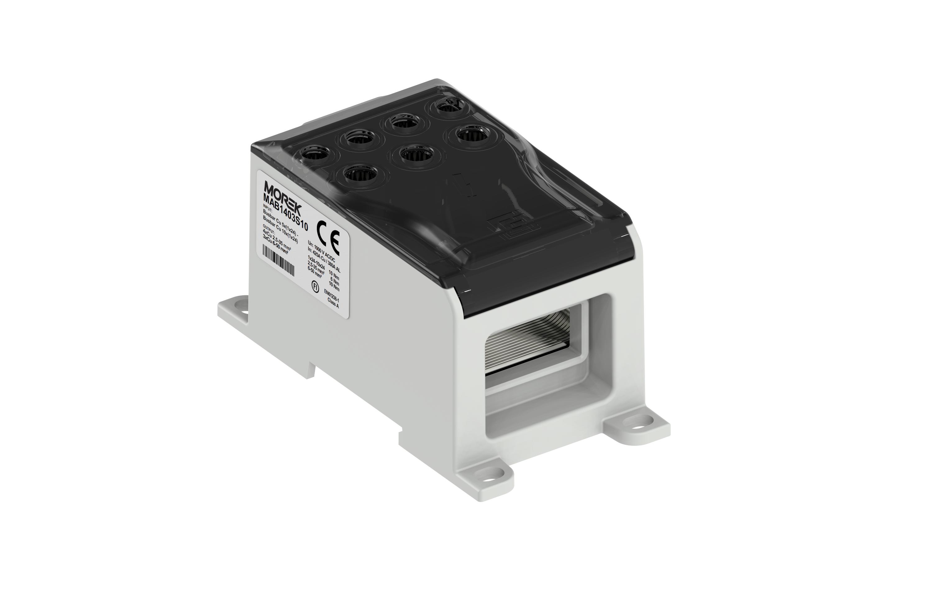 MAB1403S10 MAB1403S10 OJL400AF Jednopolni distributivni blok 400A 1000V AC/DC OJL400A Jednopolni distributivni blok 400A 1000V AC/DC, ulaz 1 fleksibilna sabirnica 10xCu(1x25mm2) izlaz samo Cu provodnik 4x2,5-35mm2 3x6-50mm2 Proizvođač