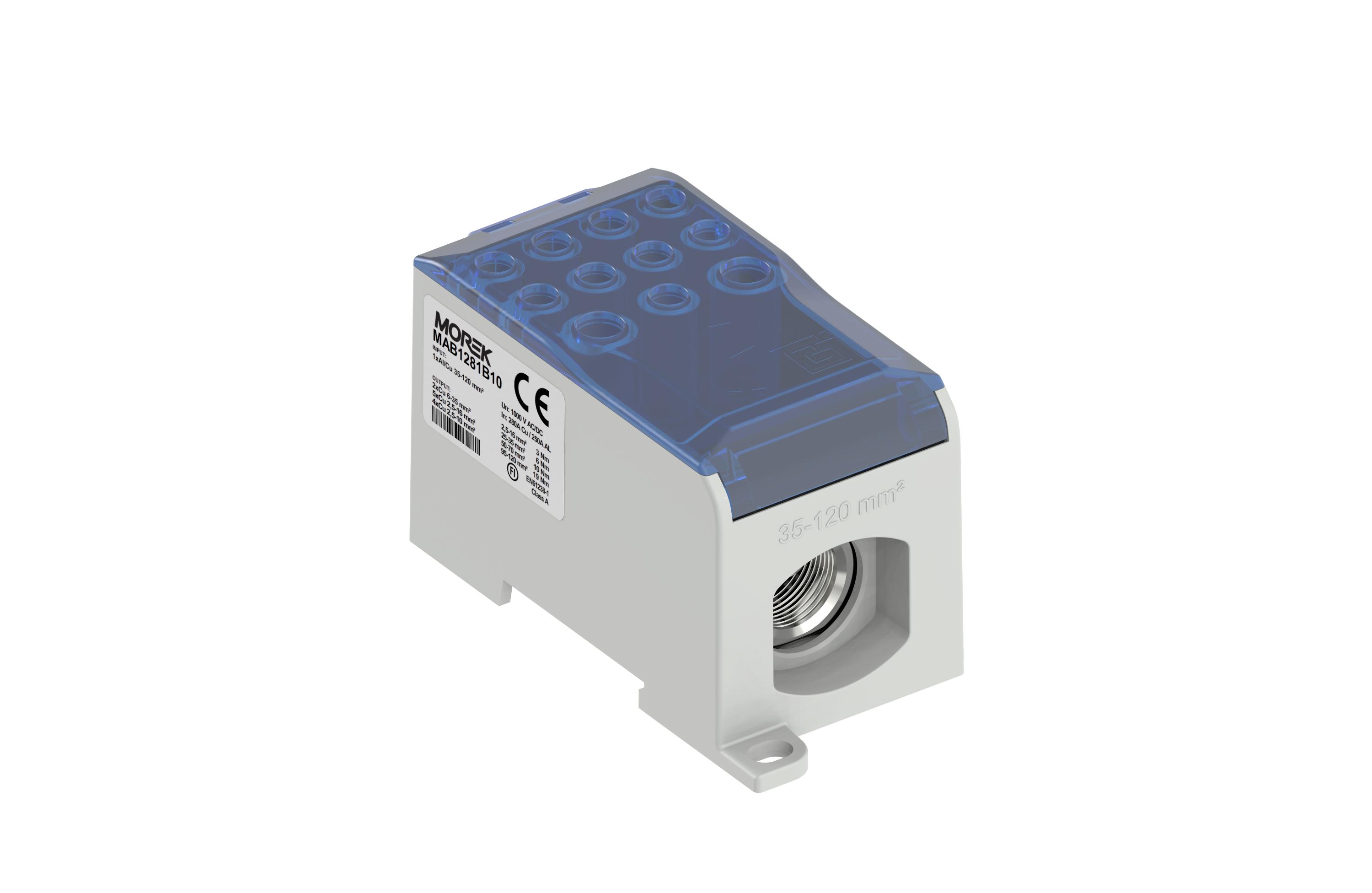 MAB1281B10 MAB1281B10 Distributivni blok OJL 280A plavi 1xAl/Cu120 OJL280A Jednopolni distributivni blok 280A 1000V AC/DC, ulaz 1 provodnik Al/Cu 35-120mm2, izlaz samo Cu provodnik 4x2,5-10mm2 5x2,5-16mm2 2x6-35mm2 Proizvođač